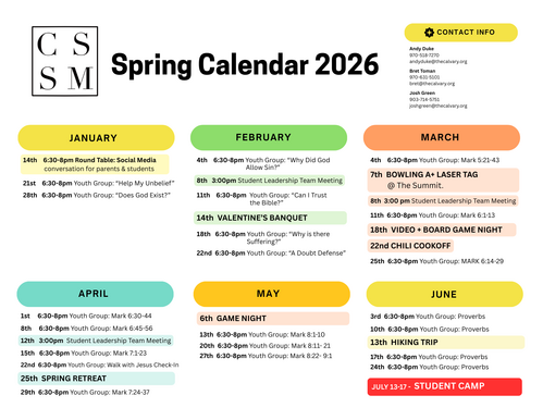 Contact our Youth Pastor, Andy Duke, at andyduke@thecalvary.org
